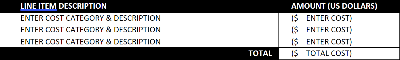 Provide specific line items from the budget narrative above. You may include any cost categories, including contingencies for risk mitigation, that support the development of your technology and payload. NOTE: Although the award amount is up to $650,000, this amount may be more than, less than, or equal to that value.