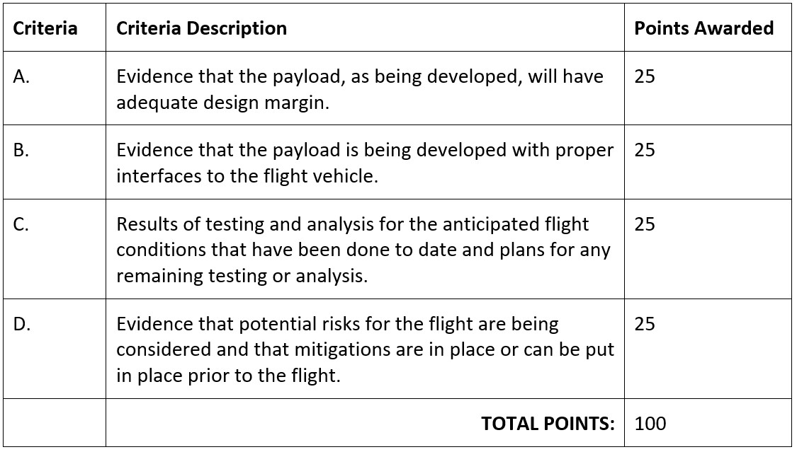 Upon successful completion of Payload Build Round 1, Winners move on to Payload Build Round 2 and will have the opportunity to compete for an additional award of $100,000 each and a suborbital flight test at no additional cost. Winners will participate in regular conference calls to present their progress to date on their plans for the payload development. Field Judges will conduct an on-site visit in March 2023 to score the progress each Winner has made. The scoring criteria for Payload Build Round 2 is as follows: